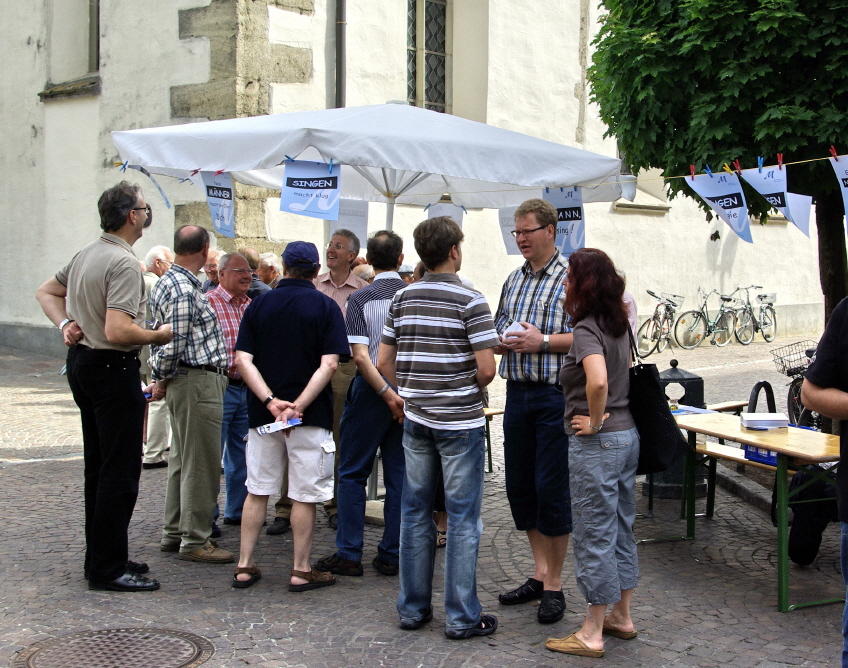 Einige der Passanten, welche sich ausführlich informiert haben, äußerten den Wunsch, bei einer Probe ihr sängerisches Talent auszutesten. Im Gespräch wurde nochmals verdeutlicht, dass niemand vorsingen muss. Es ist auch möglich, in den ersten Proben die verschiedenen Stimmen auszuprobieren. Liegt mir die Stimmlage vom Tenor 1, Tenor 2, Bass 1 oder Bass 2 am besten. Da wo sich der Sänger am wohlsten fühlt kann und soll er mitsingen.
