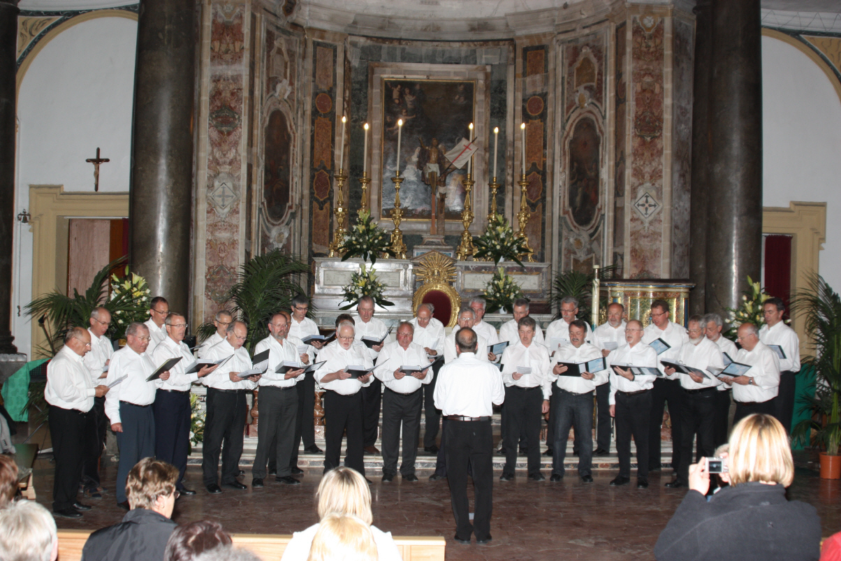 Palermo / Sizilien (wol): Bei seinen Auftritten wurde der Chor von Sängern des Männerchors Alberweiler unterstützt, die vor Jahren ebenfalls von Chorleiter Fridolin Rauscher geleitet worden waren. Einem heiteren weltlichen Konzert im Hotel Acacia Resort in Himera folgte am Donnerstag 16.4. in der Chiesa San Francesco Saverio in Palermo eine Aufführung von geistlichen Werken, die in den letzten Monaten erarbeitet wurden, wie etwa Watler Führers „Niemand hat größere Liebe“ oder Cesar Bresgens „Alle gute Gabe“. Das Publikum und Pfarrer Don Cosimo Scardato waren höchst angetan von der sängerischen Leistung des Chores.