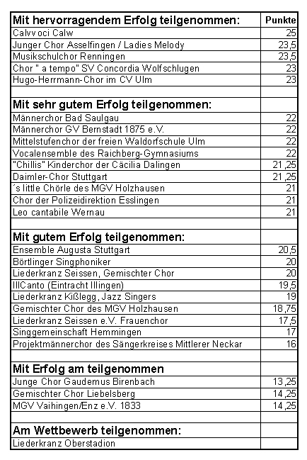 Hier die Ergebnisse aller teilnehmenden Chöre im Überblick (Quelle: Schwäbischer Chorverband):