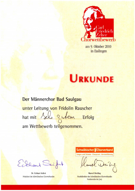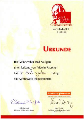 Am 9. Oktober 2010 hat der Männerchor am Carl-Friedrich-Zelter-Chorwettbewerb in Esslingen teilgenommen.