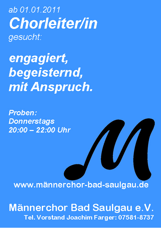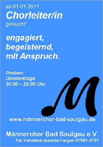 Unser jetziger Chorleiter, Fridolin Rauscher, wird sich am Jahresende nach nunmehr 44 -jähriger Tätigkeit als Chorleiter, während der letzten 10 Jahre beim Männerchor Bad Saulgau, aus der aktiven Chorleitung zurückziehen.