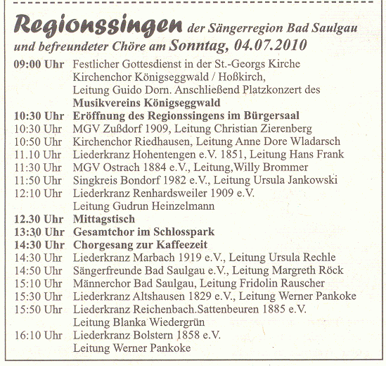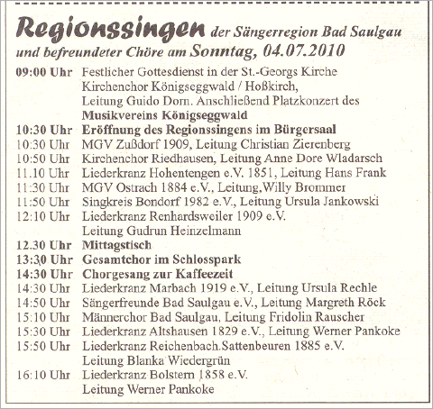 Am Sonntag, 4. Juli 2010, nimmt der Männerchor am Regionssingen in Königseggwald teil.Das gemeinsame Singen beginnt um 13.30 Uhr im Schlosspark.Um 15.10 Uhr hat der Männerchor seinen Solo-Auftritt im Bürgersaal.