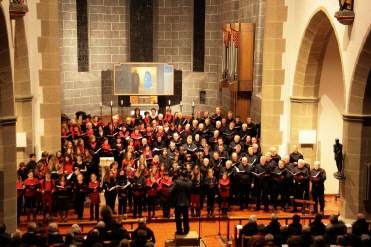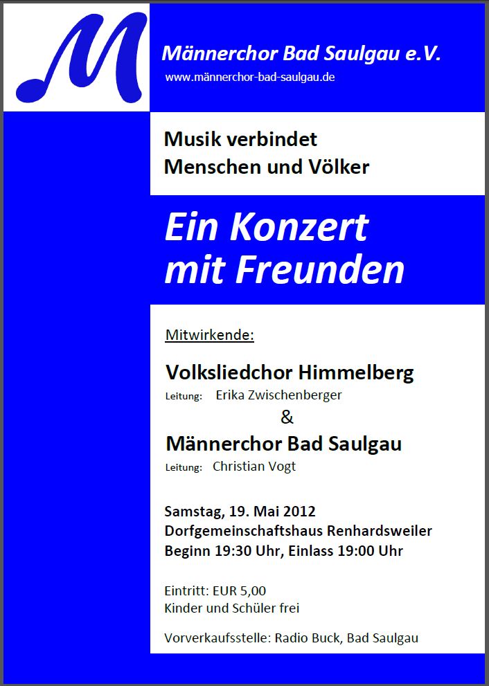 Der Volksliedchor aus Himmelberg ist zu Gast beim Männerchor Freitag, 18. Mai 2012 Ankunft am Nachmittag, Empfang mit Kaffee und Zopfbrot, Stadtführung, Bezug der Unterkunft 19.00 Uhr Abendprogramm der beiden Chöre Samstag, 19. Mai 2012 08.45 Uhr Ausflug (Führung im Zwiefalter Münster, Wanderung zur Wimsener Höhle, Mittagessen, Bootsfahrt, evtl. Bussen, Kaffee/Kuchen). 18.00 Uhr Einsingen (Dorfgemeinschaftshaus Renhardsweiler) 19.30 Uhr „Ein Konzert mit Freunden„ Saalöffnung: 19.00 Uhr (Dorfgemeinschaftshaus Renhardsweiler) Mitwirkung: Volksliedchor Himmelberg, Männerchor Bad Saulgau Anschließend gemütliches Beisammensein bei Essen, Trinken und natürlich wieder viel Gesang. Hierzu sind nicht nur alle Mitwirkenden, sondern alle Konzertbesucher herzlich eingeladen Sonntag, 20. Mai 2012 10.30 Uhr Gottesdienstgestaltung zusammen mit dem Volksliedchor (Kirche St. Johannes, Bad Saulgau) Anschließend Stehempfang bei der Stadt Bad Saulgau, vertreten durch den ersten Beigeordneten Richard Striegel (Haus am Markt, Sitzungssaal) Verabschiedung und Rückfahrt nach Himmelberg Rechts auf dem Bild sehen Sie den Männerchor zusammen mit dem Volksliedchor Himmelberg bei einem Besuch in Himmelberg im Oktober 2007. Zum Vergrößern bitte auf das Bild klicken. |