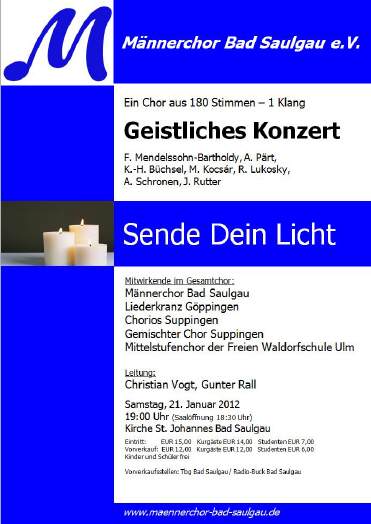 Projekt „Kirchenkonzert" Teil 2 (Details s. Teil 1 im Terminkalender 2011) Freitag, 20. Januar 2012 19.30 Uhr Kath. Kirche St. Ulrich, Kirchheim u. Teck Verantwortlich: Der Teckbote - Kirchheimer Zeitung (Zugunsten der Weihnachtsspendenaktion) Samstag, 21. Januar 2012 19.00 Uhr Kirche St. Johannes, Bad Saulgau Verantwortlich: Männerchor Bad Saulgau Sonntag, 22. Januar 2012 18.00 Uhr Christkönigskirche, Göppingen Verantwortlich: Liederkranz Göppingen |