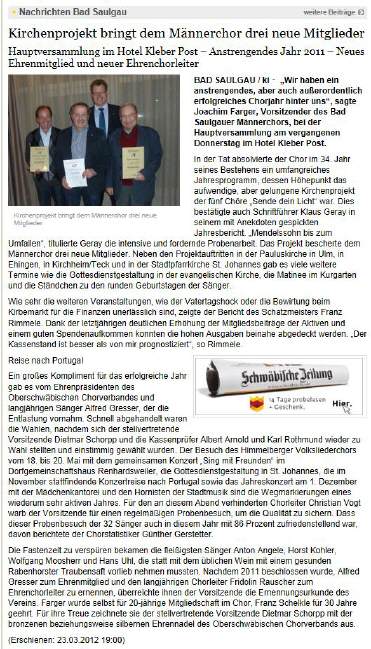 Donnerstag, 22. März 2012 20.00 Uhr Mitgliederversammlung Hotel Kleber Post, Bad Saulgau Tagesordnung: 1. Begrüßung 2. Bericht des 1. Vorstandes 3. Bericht des Chorleiters 4. Bericht des Schriftführers 5. Bericht des Kassierers 6. Bericht der Kassenprüfer 7. Entlastung 8. Wahlen 9. Verschiedenes Anträge zur Tagesordnung müssen spätestens 1 Woche vor der Mitgliederversammlung beim Vorstand Joachim Farger eingereicht werden. Bericht www.schwäbische.de 23. März 2012. Zum Vergrößern bitte auf den Bericht klicken. |