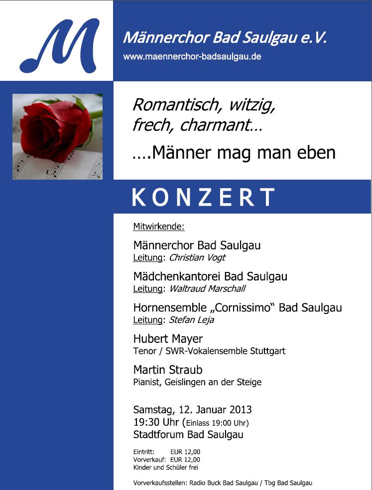 Samstag, 12. Januar 2013 19.30 Uhr Jahreskonzert Stadtforum, Bad Saulgau "Romantisch, witzig, frech, charmant" Mitwirkende: - Männerchor Bad Saulgau, Leitung Christian Vogt - Mädchenkantorei Bad Saulgau, Leitung Waltraud Marschall - Hornensemble "Cornissimo" Bad Saulgau, Leitung Stefan Leja - Hubert Mayer, Tenor / SWR-Vokalensemble Stuttgart - Martin Straub, Pianist / Geislingen an der Steige Anschließend an das Konzert: Bewirtung im kleinen Saal Kartenvorverkauf: Radio Buck und TBG |