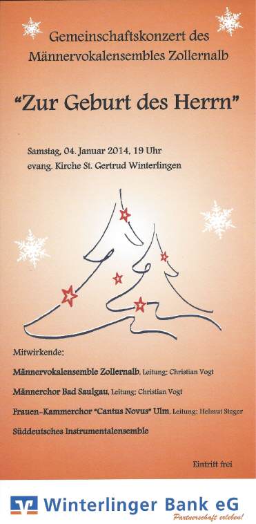 Samstag, 04. Januar 2014 19.00 Uhr Gemeinschaftskonzert des Männervokalensembles Zollernalb Mitwirkende: -> Frauen-Kammerchor Ulm "Cantus Novus Ulm" -- Leitung Helmut Steger -> Männer-Vokalensemble Zollernalb -- Leitung Christian Vogt -> Männerchor Bad Saulgau -- Leitung Christian Vogt -> Süddeutsches Instrumentalensemble -> Rezitation Manfred Tächl, Göppingen Wir verzaubern Sie eine gute Stunde lang mit weihnachtlicher Chormusik aus alter und neuer Zeit. Eintritt frei! Spenden erbeten! (Richtwert: 10,- Euro) Ev. Kirche St. Gertrud, Winterlingen |