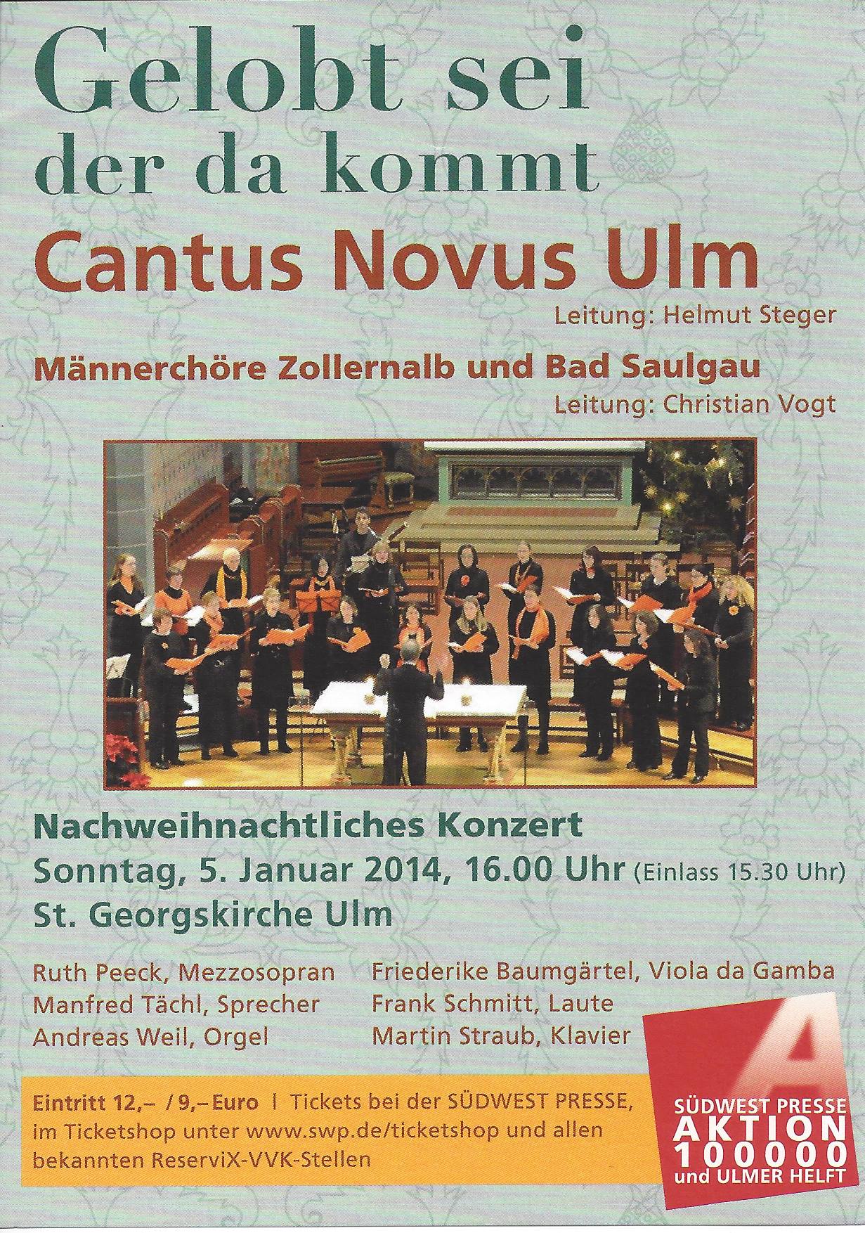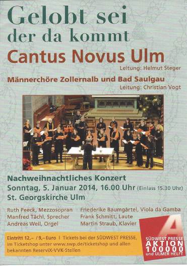 Sonntag, 05. Januar 2014 16.00 Uhr „Nachweihnachtliches Chorkonzert“ zu Gunstern der Aktion "100.000 und Ulmer helft" Mitwirkende: -> Frauen-Kammerchor Ulm "Cantus Novus Ulm" -- Leitung Helmut Steger -> Männer-Vokalensemble Zollernalb -- Leitung Christian Vogt -> Männerchor Bad Saulgau -- Leitung Christian Vogt -> Süddeutsches Instrumentalensemble -> Rezitation Manfred Tächl, Göppingen Wir verzaubern Sie eine gute Stunde lang mit weihnachtlicher Chormusik aus alter und neuer Zeit. Eintritt: 12,- Euro Kirche St. Georg, Ulm |