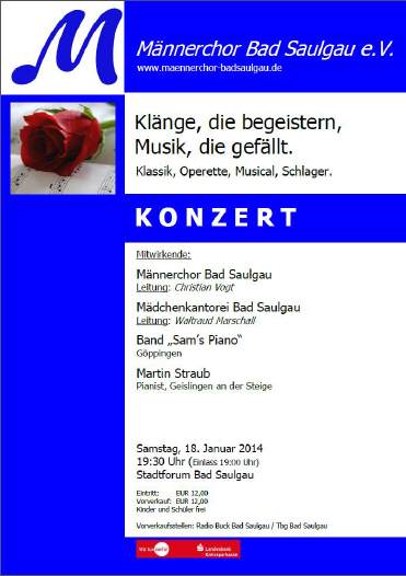 Samstag, 18. Januar 2014 19.30 Uhr (Einlass 19.00 Uhr) Jahreskonzert „Klänge, die begeistern, Musik, die gefällt“ Klassik, Operette, Musical, Schlager Mitwirkende: -> Männerchor Bad Saulgau, -- Leitung Christian Vogt -> Mädchenkantorei Bad Saulgau, -- Leitung Waltraud Marschall -> Band „Sam’s Piano“ , Göppingen -- mit Martin Straub am Klavier, Geislingen an der Steige Anschließend an das Konzert: Bewirtung im kleinen Saal Kartenvorverkauf: Radio Buck und TBG (beide Bad Saulgau) Eintritt: 12,- Euro Kinder und Schüler: Eintritt frei Stadtforum, Bad Saulgau |