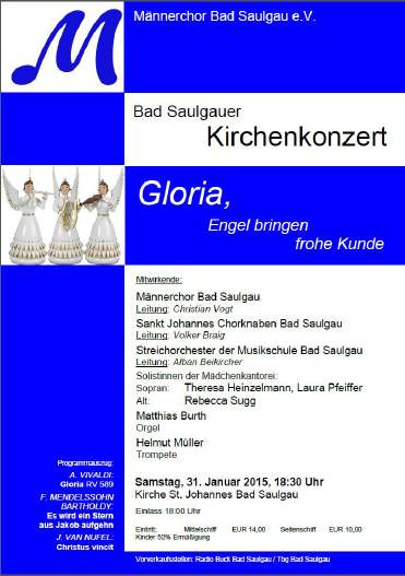 Samstag, 31. Januar 2015 18.30 Uhr Jahreskonzert Mitwirkende: - Sankt Johannes Chorknaben Bad Saulgau, Leitung Volker Braig - Streichorchester der Städtischen Musikschule Bad Saulgau, Leitung Alban Beikircher - Solisten der Mädchenkantorei Bad Saulgau: - Theresa Heinzelmann, Sopran - Laura Pfeiffer, Sopran - Rebecca Sugg, Alt - Helmut Müller, Trompete - Matthias Burth, Orgel - Männerchor Bad Saulgau, Leitung Christian Vogt Einlass: 17.45 Uhr Eintritt: - Mittelschiff 14,- Euro - Seitenschiff 10,- Euro - Kinder: 50% Ermäßigung Kartenvorverkauf: - Radio Buck, Marktplatz 4, Bad Saulgau - TBG (Tourismus Betriebs GmbH), Lindenstraße 7, Bad Saulgau Kirche St. Johannes, Bad Saulgau |