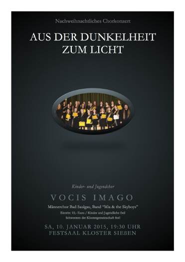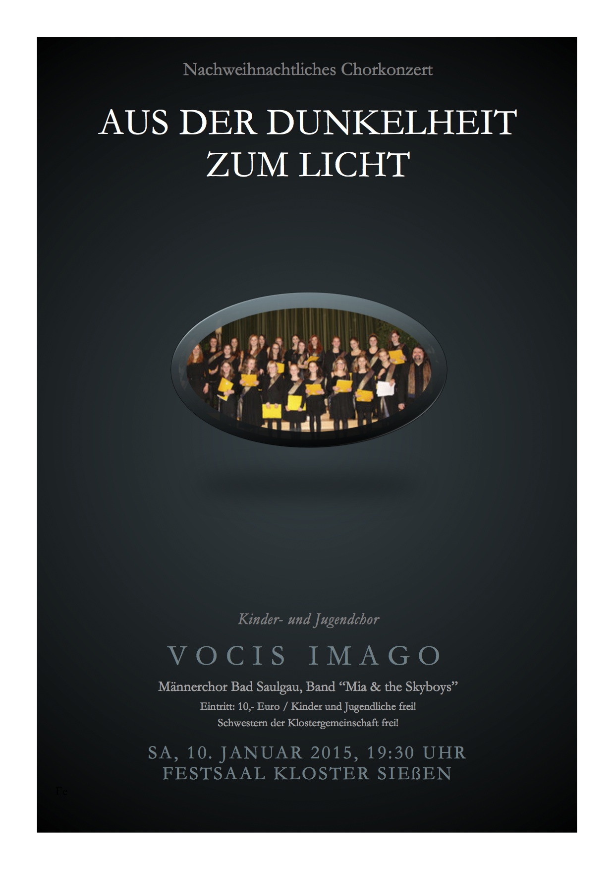 Samstag, 10. Januar 2015 19.30 Uhr Mitwirkung beim "Nachweihnachtlichen Konzert" des Kinder- und Jugendchores „vocis imago“ (Kinder- und Jugendchor der Chorgemeinschaft Haid e.V.) Mitwirkende: - Kinder- und Jugendchor „vocis imago", Leitung Christian Vogt - Männerchor Bad Saulgau, Leitung Christian Vogt - Band „Mia & the Skyboys" Festsaal, Kloster Sießen |