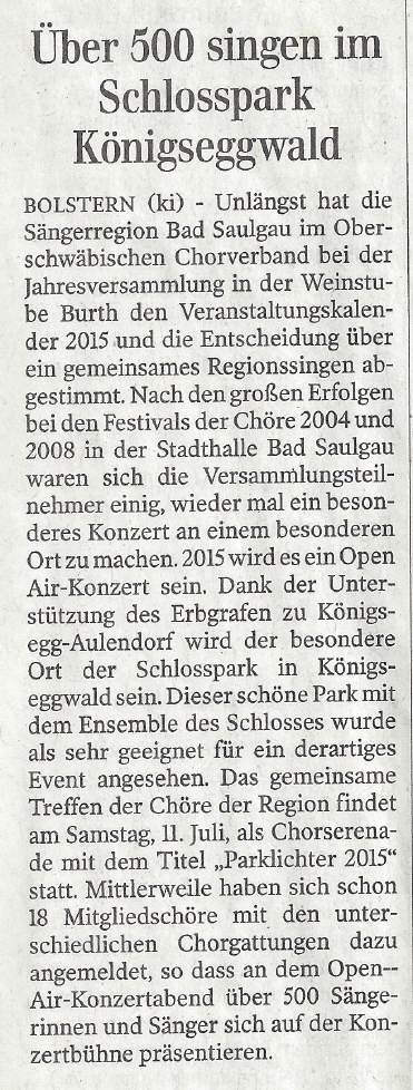 Samstag, 11. Juli 2015 19.30 Uhr (Einlass: 18.30 Uhr) Teilnahme an der Chorserenade „Parklichter 2015" Veranstalter: Oberschwäbischer Chorverband, Region Bad Saulgau Schlosspark, Königseggwald |